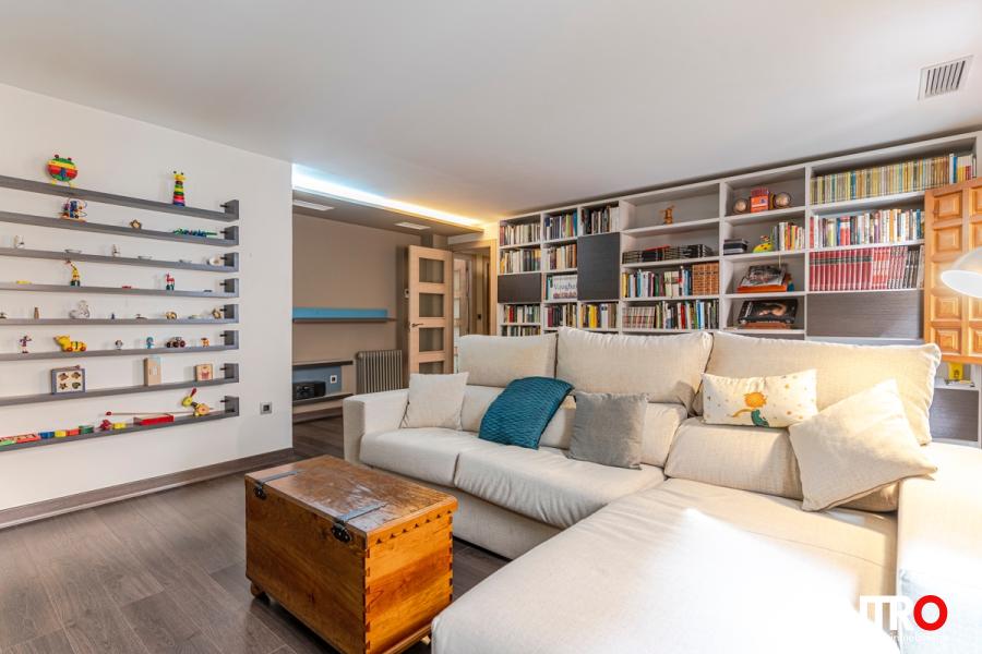 El diseño del interior refleja una atención al detalle en cada rincón, con acabados de alta calidad como el elegante revestimiento de madera en el pasillo y estanterías integradas. La iluminación indirecta, a través de luces empotradas en el techo, crea un ambiente cálido y acogedor en toda la vivienda.