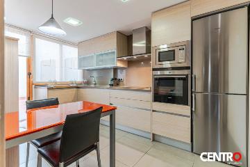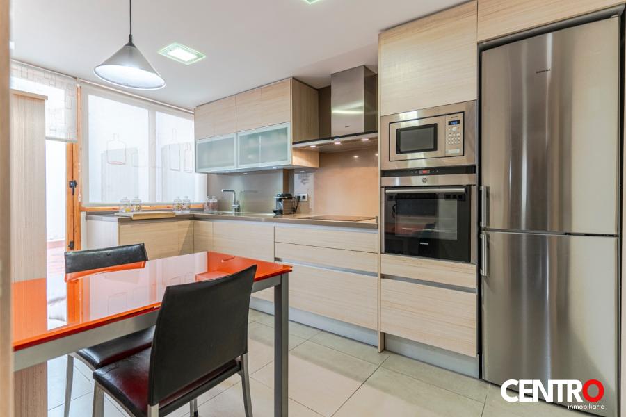 La cocina, completamente equipada con electrodomésticos de última generación, presenta un diseño contemporáneo que incluye horno y microondas integrados, así como amplios armarios de tonos claros que maximizan la sensación de espacio y luminosidad. A su lado, la terraza ofrece un área privada y tranquila para disfrutar del aire libre, con suelos de baldosas y protección en las ventanas que garantizan seguridad y privacidad.